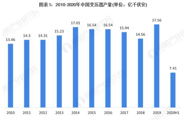 变压器分类主要分为电力变压器、配电变压器、干事变压器和黑龙江非晶合金变压器和卷铁心变压器。2015年8月,工信部、质检总局、发改委共同发布关于印发电力行业《配电变压器能效提升计划(2015-2017年)》的通知,计划完善快速配电变压器配套体系建设,开展快速配电变压器制造和应用示范,提升快速配电变压器产业化能力,从原料、工艺、节能技术等方面着手。根据中国机经网的数据显示,2010-2020年,我国变压器产量呈现波动趋势。2019年为17.56亿千伏安,同比上升20.6%。2020年上半年我国变压器产量为7.41亿千伏安,同比下降5.52%。