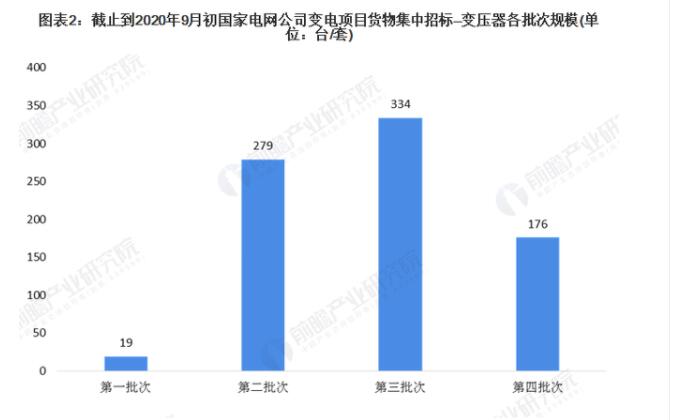 截止到2020年9月初,国家电网变电项目关于变压器各批次招标中,第三批次招标规模较大,为334台/套;其次是第二批,为279台/套;招标规模较小的是批,为19台/套。