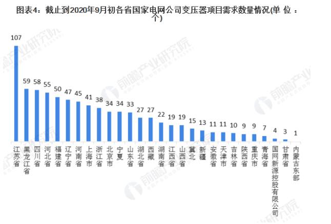 从各省的国家电网公司对变压器的需求量来看,截止到2020年9月初需求较多的是107个的国网江苏省电力有限公司,占比13.24%;其次是国网黑龙江省电力有限公司,需求量为59个。